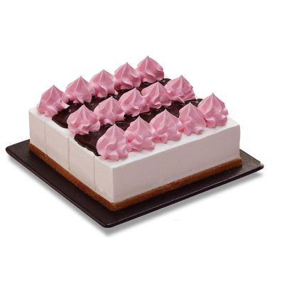 Swirls of vanilla and raspberry flavoured ice cream, topped with rich chocolate confectionery on a spongy cake.